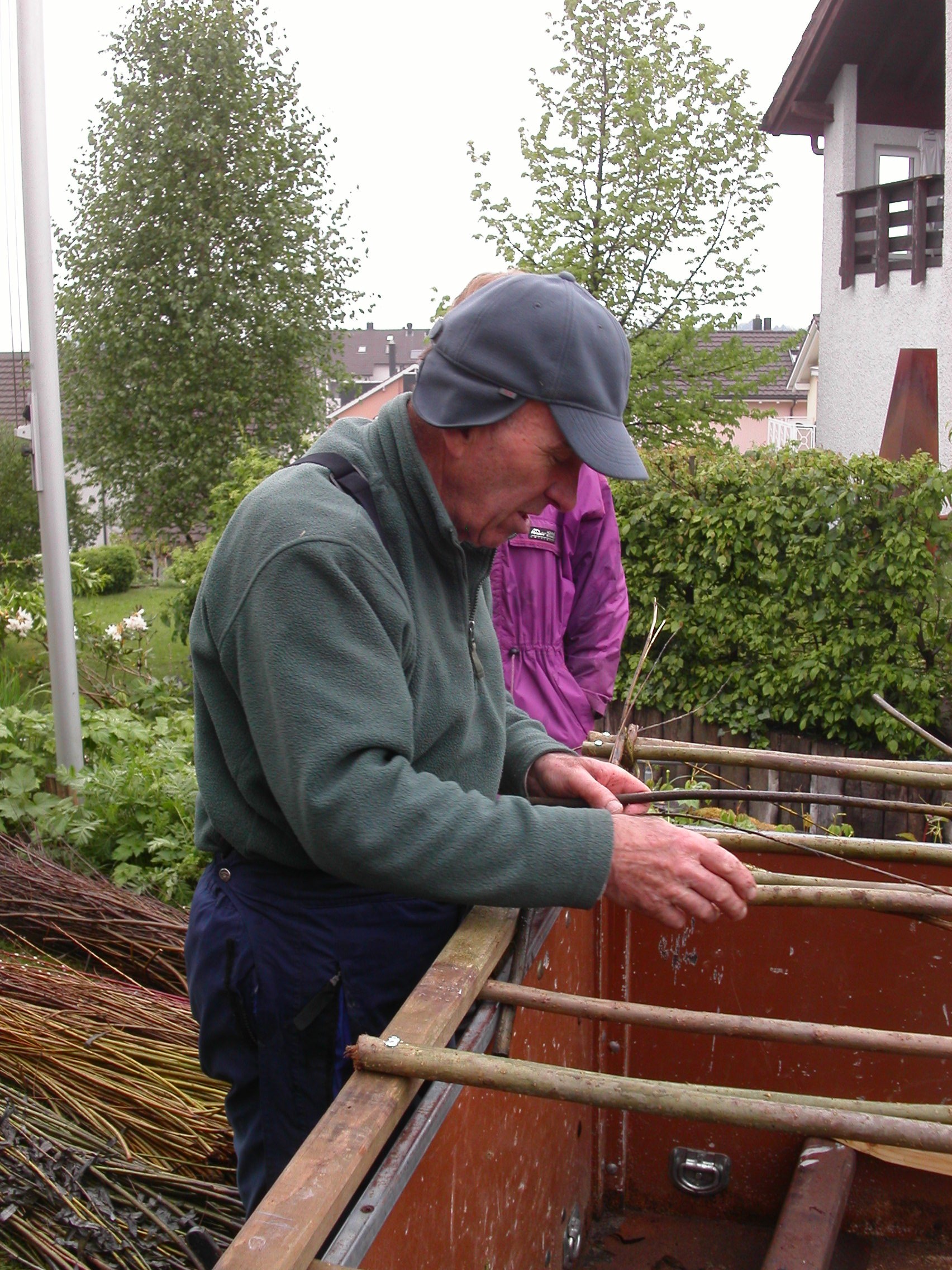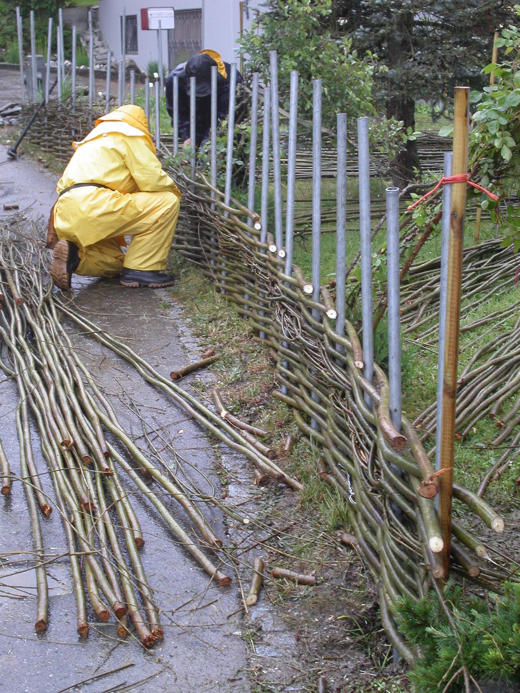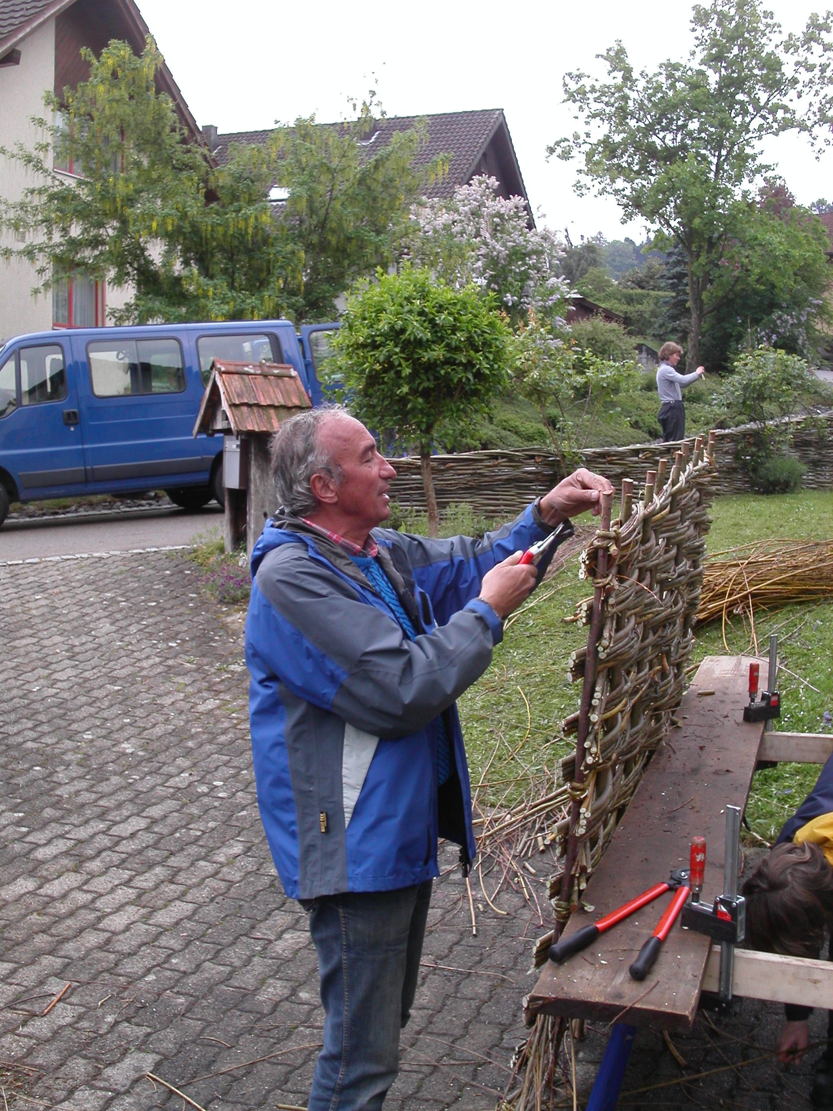 Der deutsche Korbmachermeister und IGK SCHWEIZ-Mitglied vermittelte uns seine Erfahrungen als Hersteller von Zäunen und Sichtschutzelementen. Trotz schlechtester Wetterbedingungen wurde bei Heidi und Urs Ritter das ganze Wochenende gearbeitet wie in einem Bienenhaus.